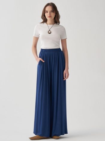 Achieve an elegant look with the Indigo Blue Elastic Waist Wide-Leg Trousers, designed for those who seek sophistication in details.