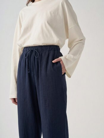 Şıklığı detaylarda arayanlara özel Lacivert-Beli Lastikli Müslin Pantolon ile zarif bir görünüm yakalayın. Günlük ve özel kombinler için ideal tasarım