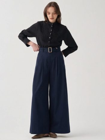 Şıklığı detaylarda arayanlara özel Lacivert-Kemerli Pileli Bol Paça Pantolon ile zarif bir görünüm yakalayın. Günlük ve özel kombinler için ideal