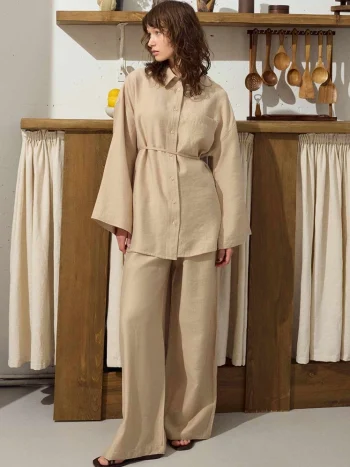 BELT DETAIL PANT SUIT SET FEATURES: Mobile bird’s eye detail belted, wide sleeves, collarless, comfortable cut, small side slits, dropped