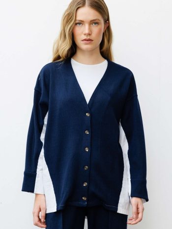 Poplin Knit Cardigan Detailed Navy Blue Pants Set