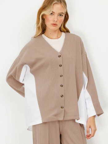 Poplin Knit Cardigan Detail Coffee Pants Set