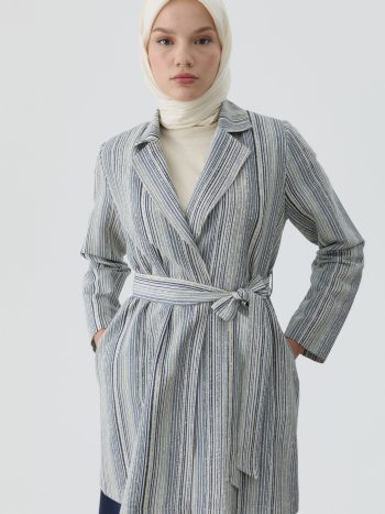 This timeless striped pattern with a belt detail that accentuates the waist adds a modern and elegant touch to the