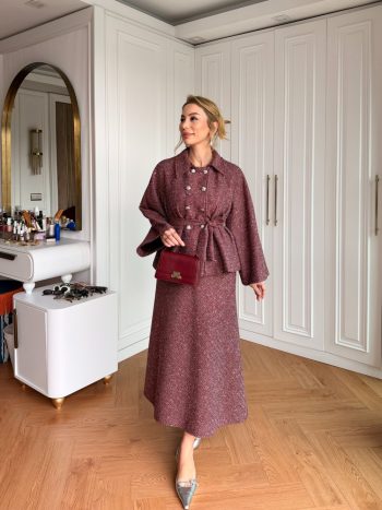 This set is crafted from first-class suede-coated sequin fabric. The jacket features full-length button closure and wide sleeves with a