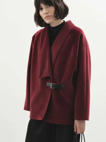 FEATURES OF THE BURGUNDY TRENCH COAT WITH BELT BUCKLE Shawl collar, belt buckle and button closure, relaxed fit, lined trench