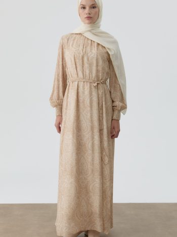 This eye-catching dress with shawl patterns offers an elegant posture thanks to the belt detail at the waist. Fabric Content: