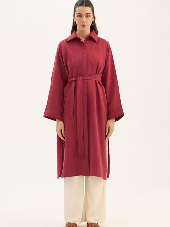 This burgundy long tunic stands out with its natural texture and elegant stripes, making it one of the fresh and