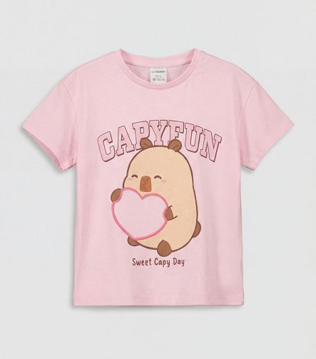 Pink Capyfun Printed Round Neck Girls’ T-Shirt