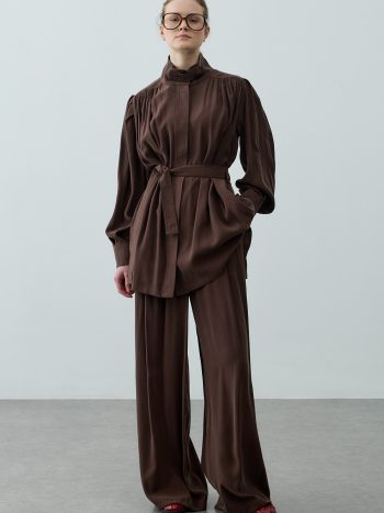 Tensel dokuma kumaştan, dik yakalı, önü düğme kapamalı, uzun kollu, manşetli, seyyar kemerli, cepli gömlek ve fermuarlı, düğme kapamalı, pileli,