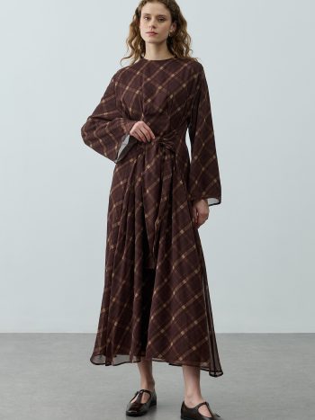 Şifon kumaştan, % 100 pamuk astarlı, uzun geniş kollu, önü bağlama detaylı, sırtı fermuar kapamalı, ekose desenli, maxi boy elbise.