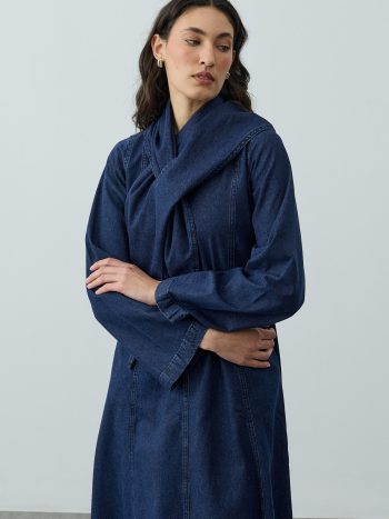 Denim dokuma kumaştan, sırtı fermuar kapamalı, bisiklet yakalı, uzun kollu, seyyar fular detaylı, elbise. 1(36/38) BEDEN Uzunluk:136 cm, Göğüs: 44