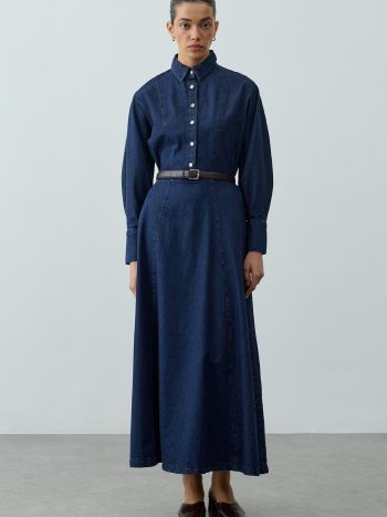 Denim dokuma kumaştan, gömlek yakalı, balon uzun kollu, manşetli, önü metal düğme kapamalı, maxi elbise. 1(36/38)Beden: Uzunluk:137 cm, Kol Uzunluğu: