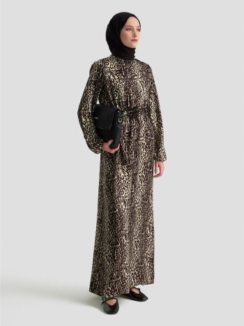 Floş dokusuyla zenginleşen leopar deseni, elbiseye benzersiz bir derinlik ve hareket kazandırıyor. Beldeki kemer detayı ise zarif bir siluet yaratırken,