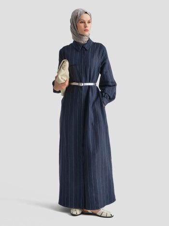 Lacivert üzerine ince beyaz çizgileriyle marin ruhunu şehir stiline taşıyan bu uzun elbise, keten dokusunun ferahlığıyla gün boyu konfor sunar.