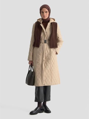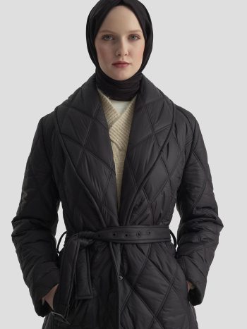 Sıcak tutan kapitone dokusu ve beldeki kemer detayıyla öne çıkan bu kaban, fonksiyonelliği modern bir siluetle birleştirir. Yapıdaki dokusal desen