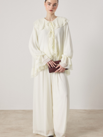 Yaka ve Kol Volanlı Şifon Takım – Krem