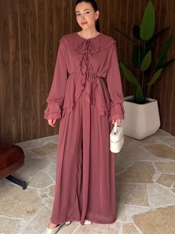 Yaka ve Kol Volanlı Şifon Takım – Pembe
