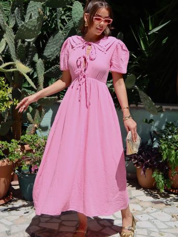 Beli Lastikli Bağcık Detaylı Yarım Kol Müslin Elbise PEMBE 9331-E