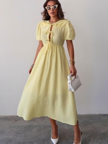Bağcık Detaylı Beli Büzgülü Müslin Elbise SARI 9362-E