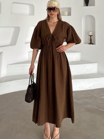 Beli Lastikli Bağcık Detaylı Yarım Kol Müslin Elbise KAHVE 9331-E