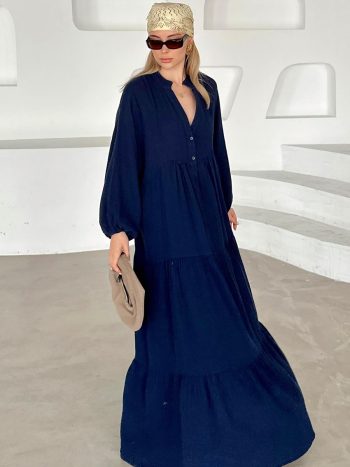 Yarasa Kol Düğme Detaylı Müslin Salaş Elbise LACİVERT 9330-E