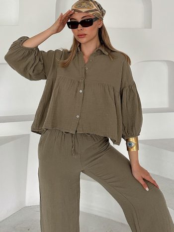 Salaş Kısa Gömlekli İkili Müslin Takım HAKİ 9355-TK