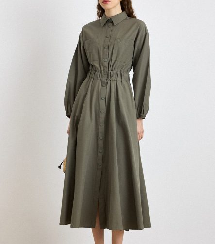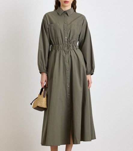 Göğüs Cepli Beli Lastikli Poplin Elbise HAKİ 9286-E