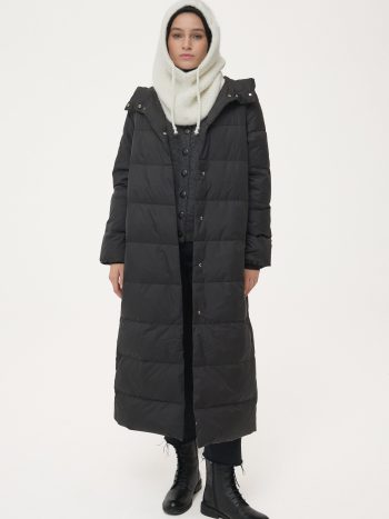 Kaz tüyünün üstün sıcaklık sağlayan hafif yapısını minimal bir siluetle buluşturan bu manto, gizli kapama detayı sayesinde temiz ve kesintisiz