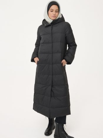 Gizli Kapama Detaylı Kaz Tüyü Manto – Siyah