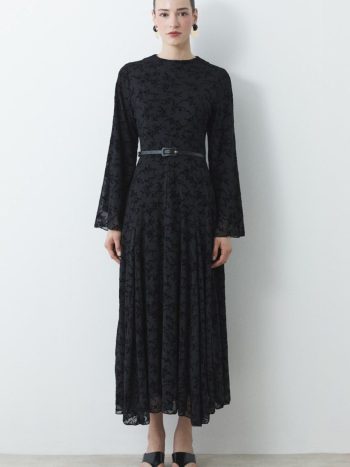 Zarif ve dikkat çekici tasarımıyla öne çıkan bu elbise, tül kumaş üzerine uygulanan flok baskı detayı sayesinde sofistike bir görünüm