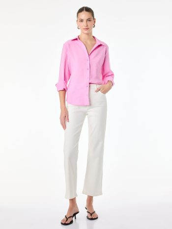 Gömlek, modern ve klasik detayları bir arada buluşturan tasarımıyla dikkat çekiyor. Hakim yaka ve uzun balon kol özellikleri gömleğe zarif