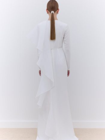 Saten kumaştan yapılmış, yüksek yakalı ve pelerin detaylı, sofistike bir elbise. Kolları gizli fermuarlı, omuzları dolgulu ve elbise tamamen astarlı.