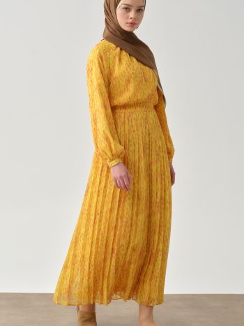 Zarif pliseler ve konforlu lastik detayı ile öne çıkan bu bel lastikli pliseli elbise, hareketli tasarımı ve rahat kesimi ile