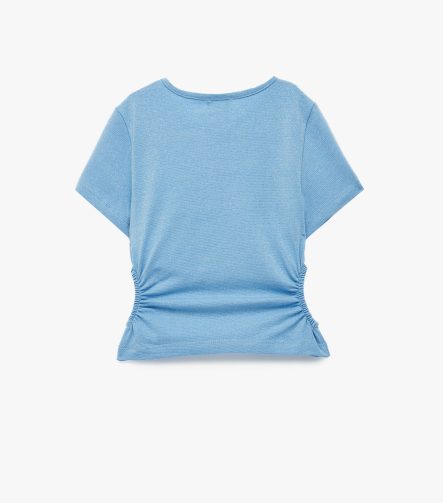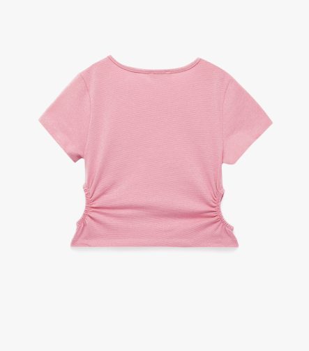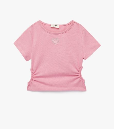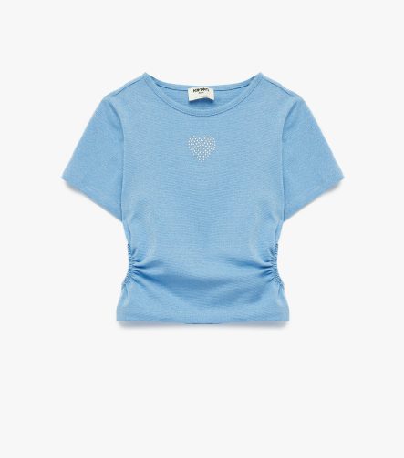 Kız Çocuk Bisiklet Yaka Slim Fit Kalpli Taşlı Büzgü Detaylı Pamuklu Kısa Kollu Crop Bluz