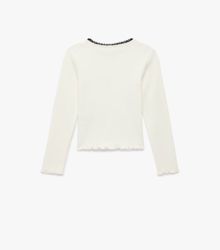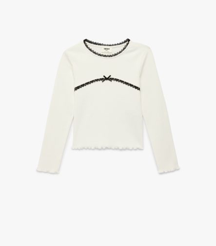 Kız Çocuk Uzun Kollu Dantel ve Fiyonk Detaylı Bisiklet Yaka Pamuklu Tişört