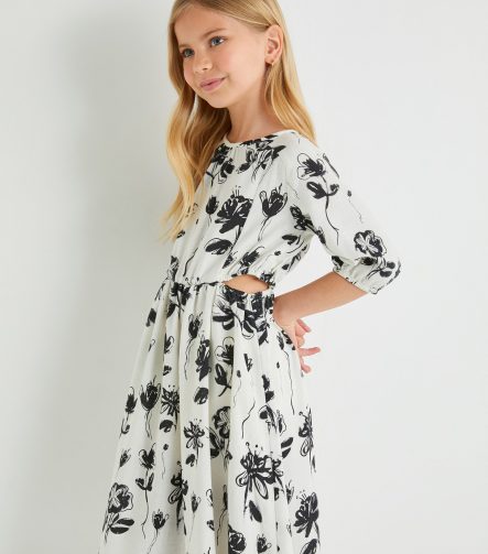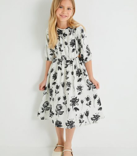 Kız Çocuk Keten Elbise Çiçekli Balon Kollu Yuvarlak Yaka