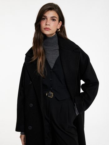 Kruvaze kesimi ve kemerli detayı ile öne çıkan kaşe kaban, soğuk havalarda şıklığınızı korumanız için ideal bir seçim sunuyor. Modern
