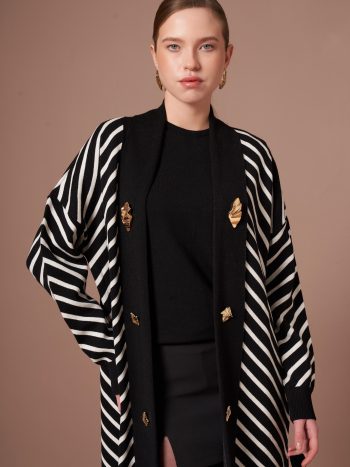 FTZ Women Kadın Düğme Detay Çizgili Hırka Siyah 25149