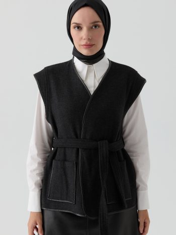 Deri Biye Detaylı Cepli Yelek – Siyah