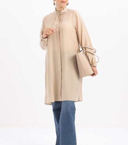 Bej Fırfırlı Yaka Bağlamalı Uzun Gömlek