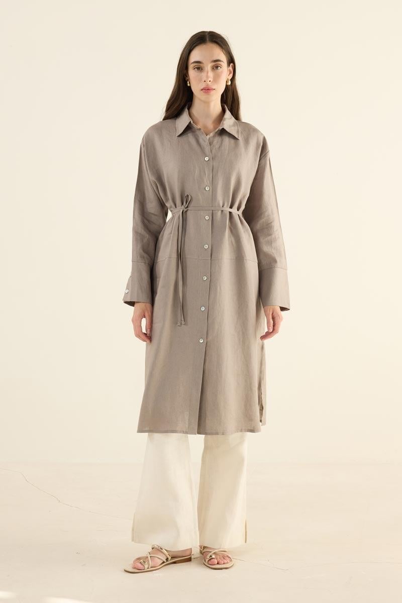 Doğal ve ferah bir görünüm sunan taş rengi uzun tunik, yaz sezonunun hafif ve şık parçalarından biri. %88 Tencel ve %12 Pes karışımından üretilen kumaşı, yumuşak dokusu ve nefes alabilir yapısıyla gün boyu konfor sağlar. Minimal tasarımı, gizli patlı düğme detayı ve eteğinde yer alan zarif kavis kesimi ile modern bir duruş sergiler.