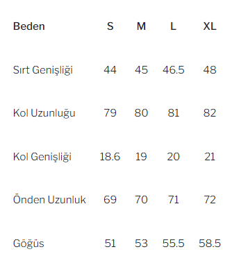 Not: Verilen ölçüler en küçük bedene aittir, bedenler arasında ortalama 4 cm fark bulunmaktadır.