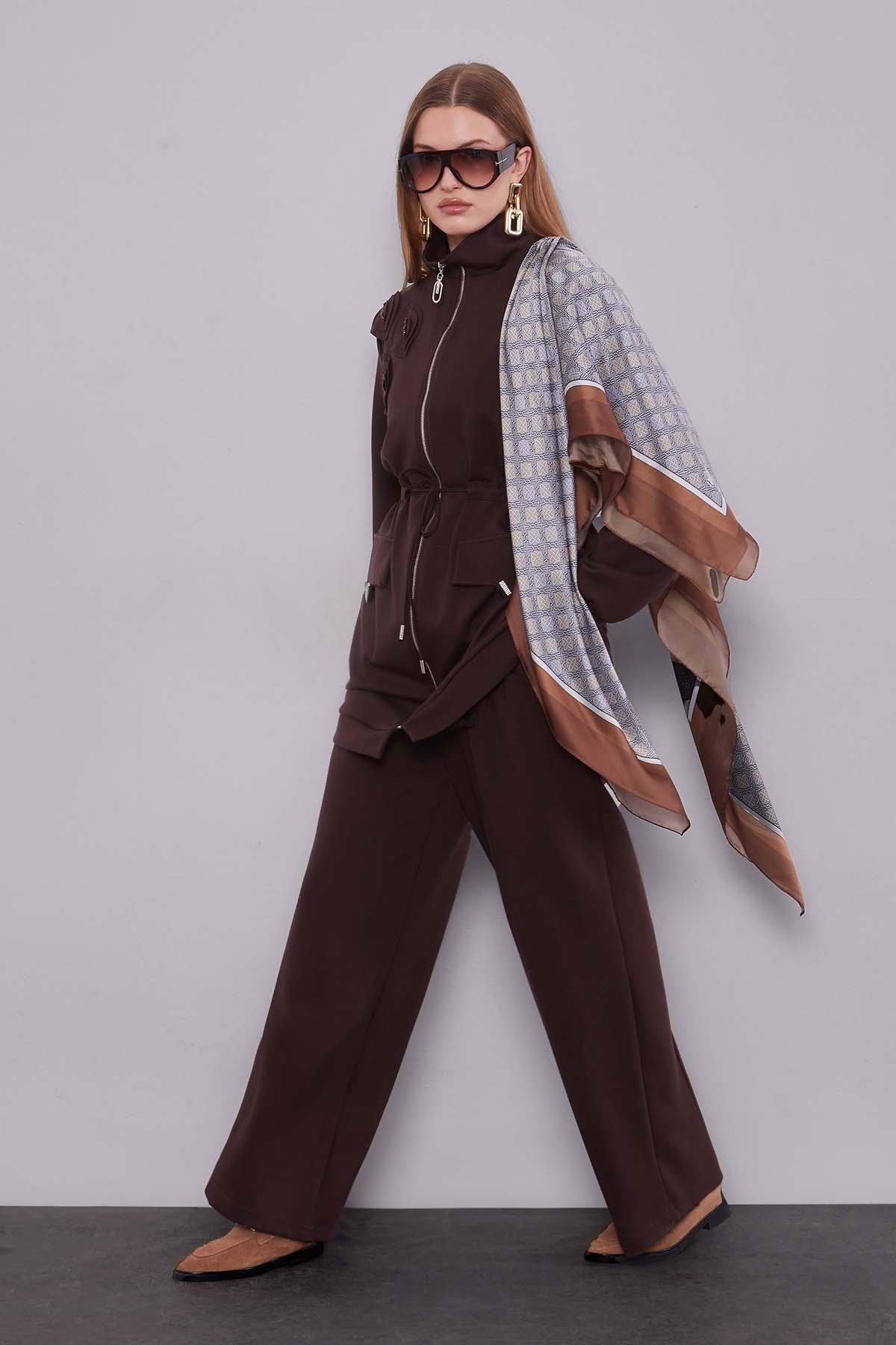 Tunik ve pantolonun uyumlu siluetiyle öne çıkan bu takım, aplike cep detaylarıyla sade tasarıma sofistike bir karakter kazandırır. Akıcı kumaşı gün boyu konfor sağlarken, modern çizgisi şehir stiline güçlü ama yalın bir dokunuş ekler.