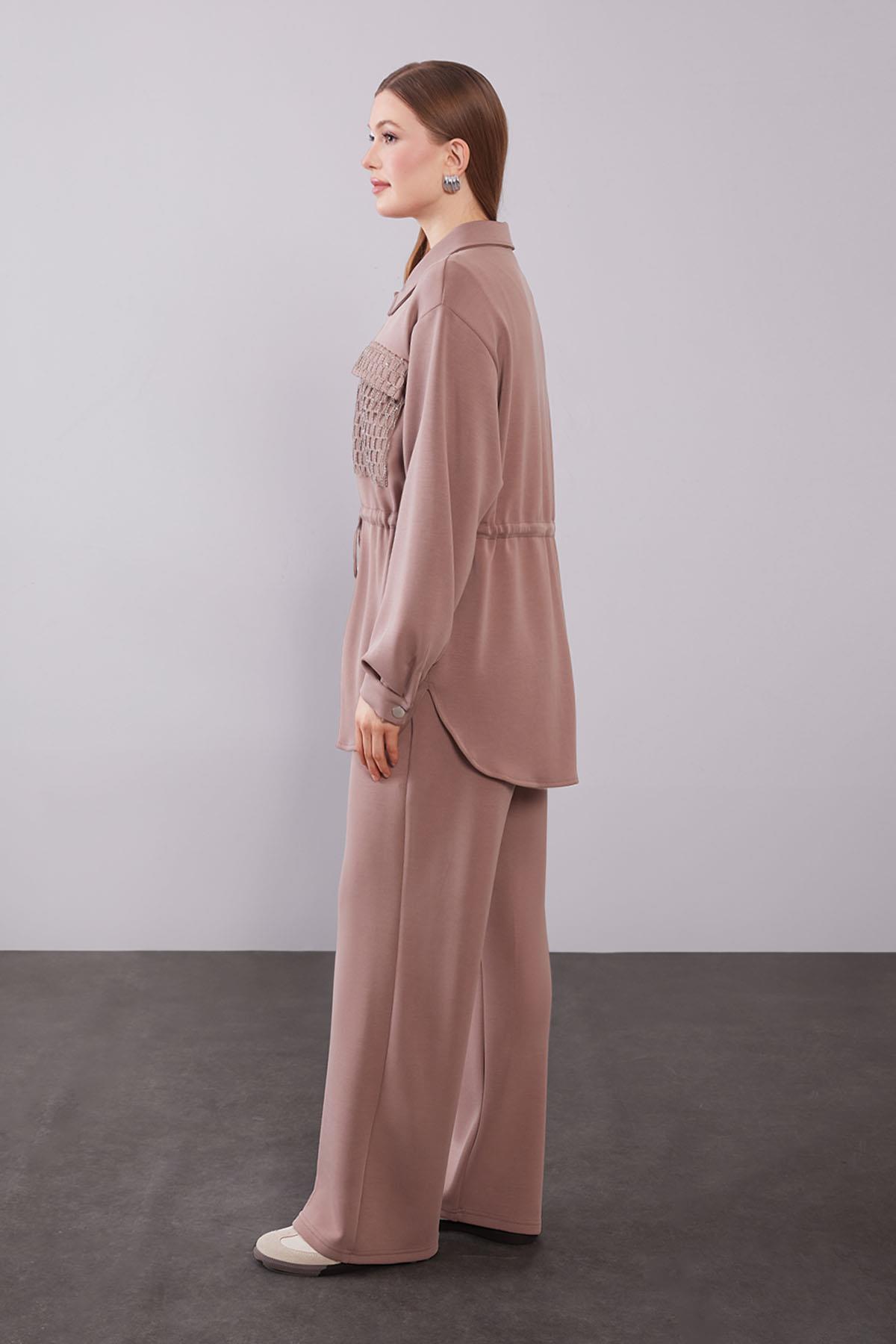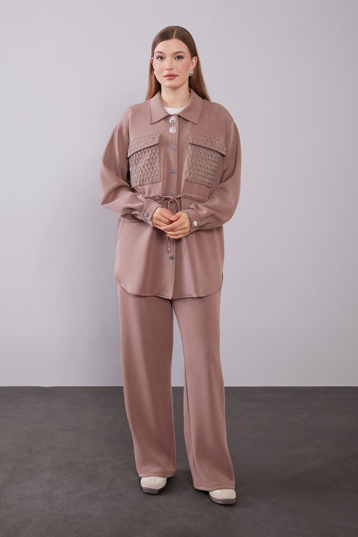 Markamızın en şık file cep detaylı ikili takım modeli modern tasarımıyla günlük şıklığınızı yeniden yorumluyor. Takıma özgünlük katan file cep detayı sportif ve trend bir görünüm sunarken aynı zamanda pratik kullanım sağlıyor. Üst ve alt parçanın uyumlu kesimi sayesinde şehir hayatından hafta sonu kombinlerine kadar geniş bir kullanım alanı sunuyor. Hem özel davetlerde hem de günlük stilinizde rahatlıkla kullanabileceğiniz çok yönlü tasarımıyla gardırobunuzun değerli parçalarından biri olmaya adaydır.