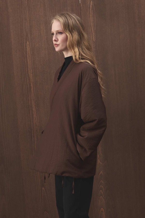 Kimono yakalı, bağlamalı, cep detaylı, rahat kalıp, astarlı anvelop bağlamalı kapitone mont.