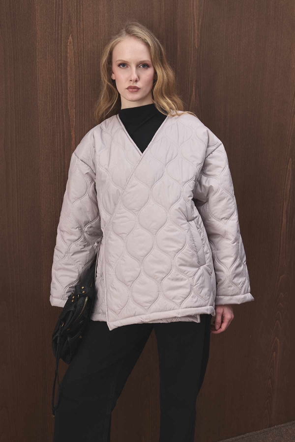 Kimono yakalı, bağlamalı, cep detaylı, rahat kalıp, astarlı anvelop bağlamalı kapitone mont.
