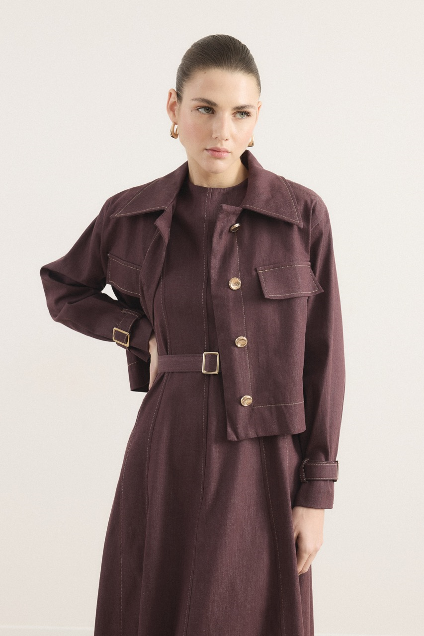 Modern ve feminen tasarımıyla öne çıkan bu denim jile elbise, vücut proporsiyonunu dengeleyen formu sayesinde daha ince bir siluet görünümü sunar. Kulplu yapıya sahip jile elbise, gold düğme detaylı kısa ceket ile tamamlanarak şık ve güçlü bir stil oluşturur. Gold tokalı kaplama kemer bel hattını vurgularken, zıt dikiş detayları tasarıma hareket ve karakter kazandırır. %80 pamuk içeriğe sahip denim kumaşı gün boyu konfor sağlar. Hem tek başına hem takım olarak farklı kombin seçenekleri sunar.