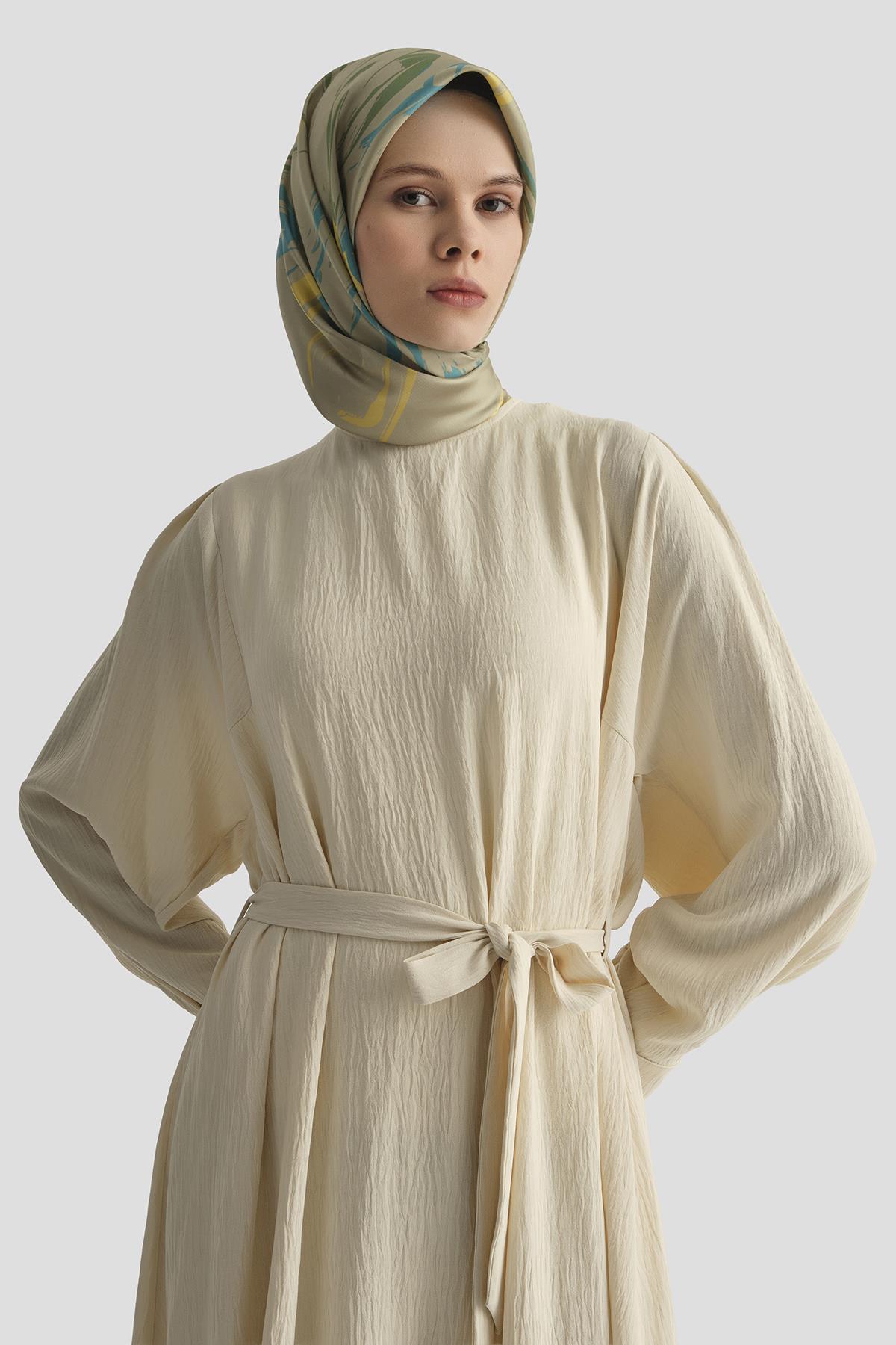 Akışkan dokusu ve doğal duruşuyla dikkat çeken bu elbise, balon kolları ve belden bağlamalı kuşağı sayesinde feminen bir silüet öne çıkarıyor. Sade çizgilerin modern bir incelikle yorumlandığı tasarım, şehir temposuna eşlik eden zamansız bir şıklık sunuyor. Gardırobun sezon sınırlarını aşan bu parçası, minimalizmin en zarif hali.