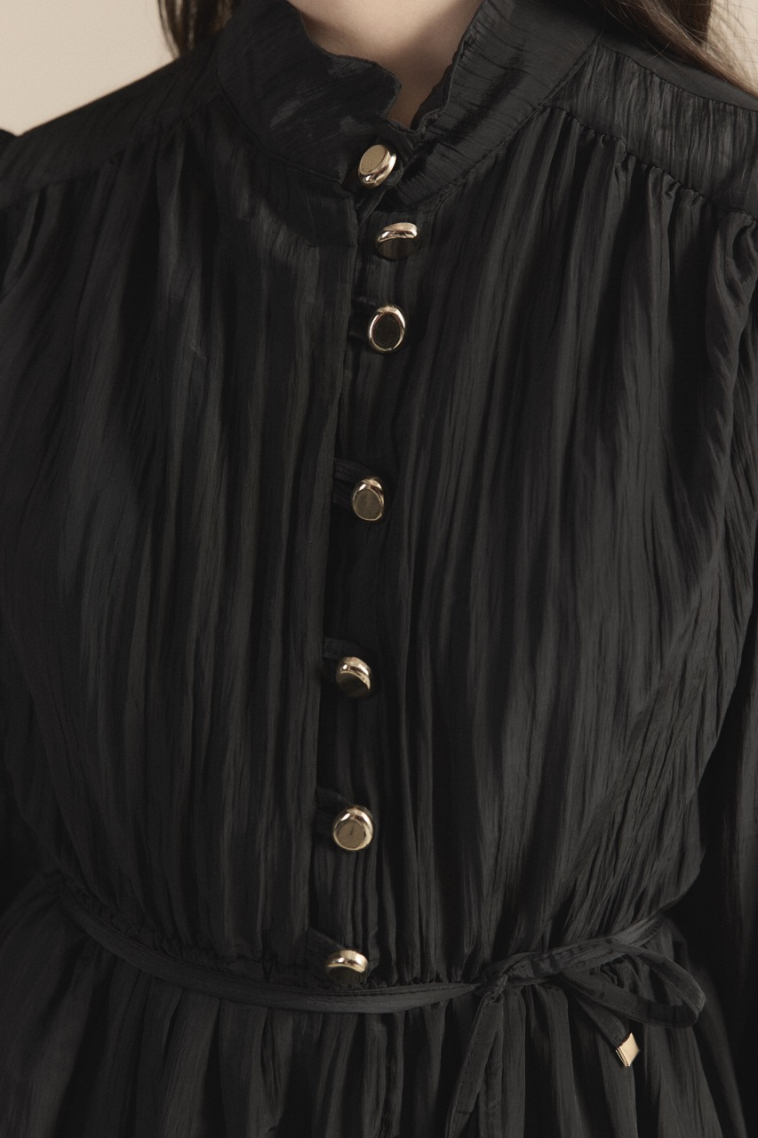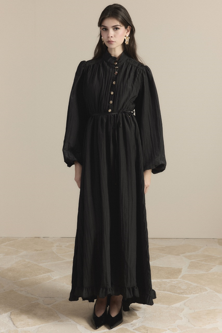 Asimetrik Fırfırlı Pilise Elbise – Siyah