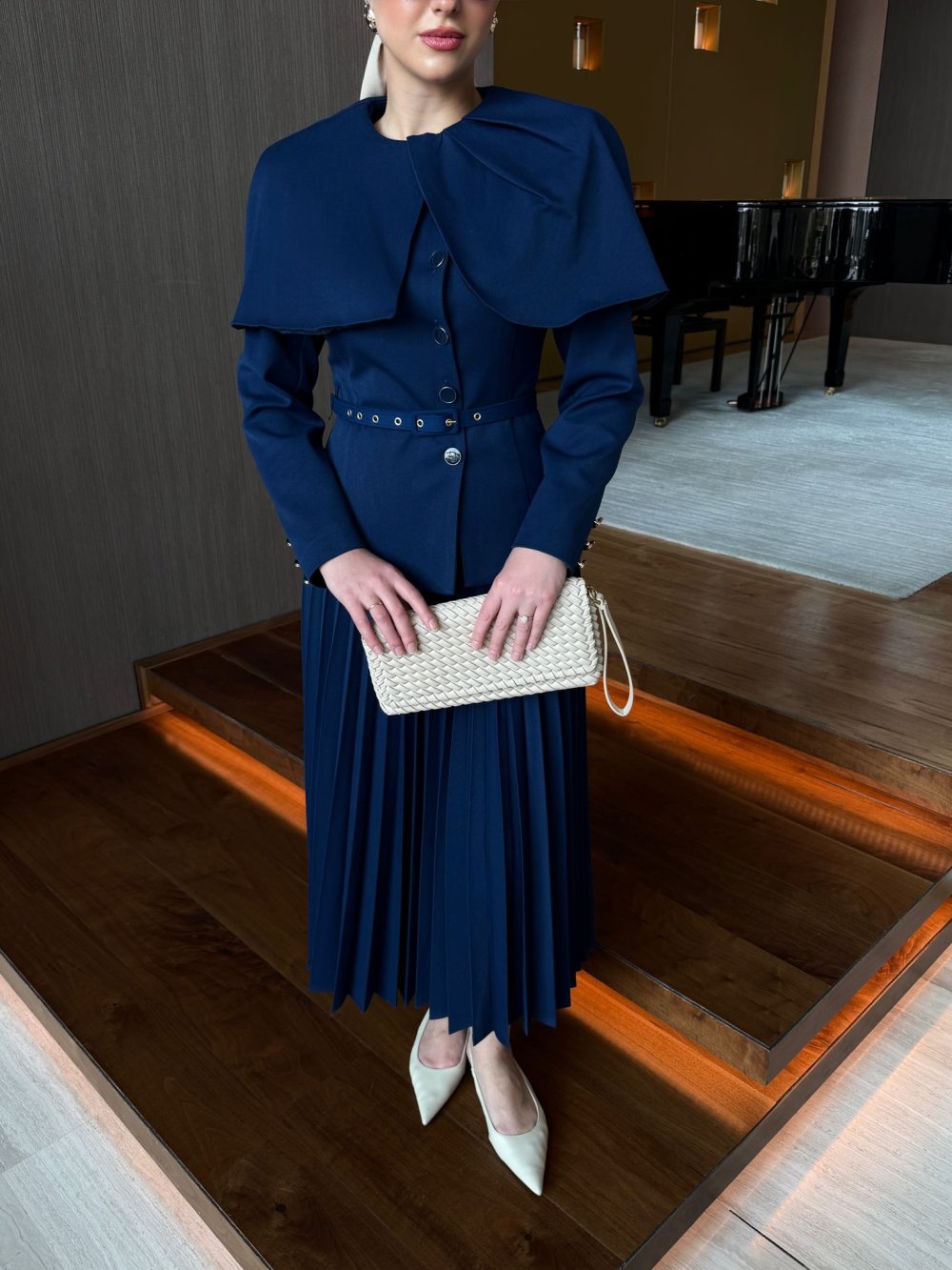 Tunik ve pantolonun uyumlu siluetiyle öne çıkan bu takım, aplike cep detaylarıyla sade tasarıma sofistike bir karakter kazandırır. Akıcı kumaşı gün boyu konfor sağlarken, modern çizgisi şehir stiline güçlü ama yalın bir dokunuş ekler.